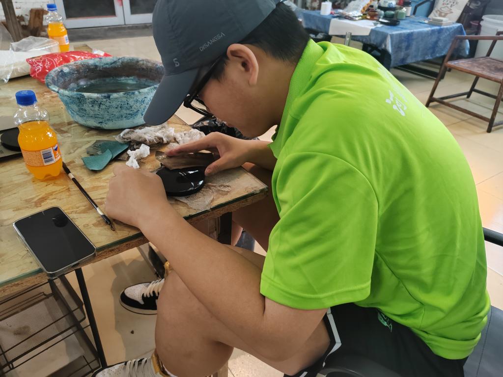 在韩老师的工作室,实践队员们观摩了漆器制作的过程,并亲自动手体验了打磨、涂油、抹粉、抛光等漆器制作程序,据悉,上漆、晾干、打磨的过程需要反复十几次,队员们真切感受到大漆工艺的繁复与精细,体会到精益求精的大国工匠精神的深刻内涵。