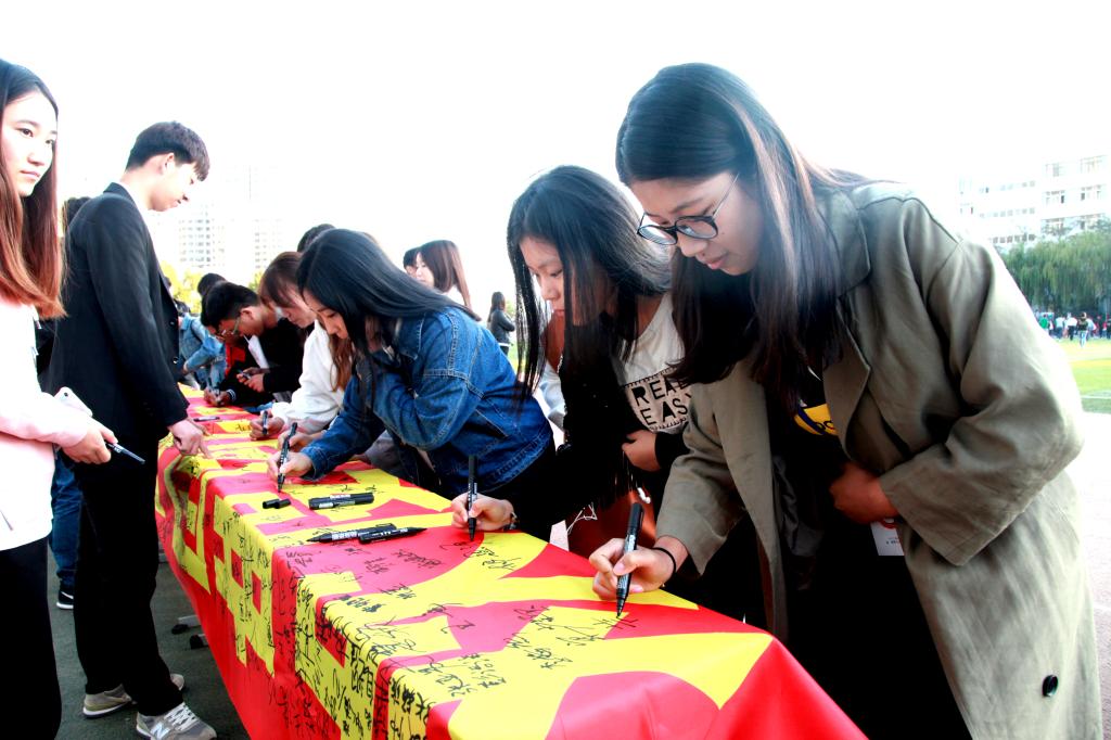 师生在横幅上签名寄语(一)