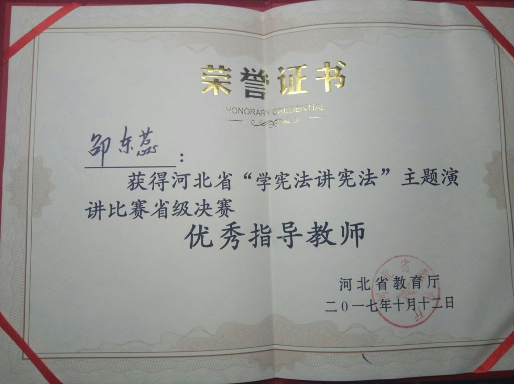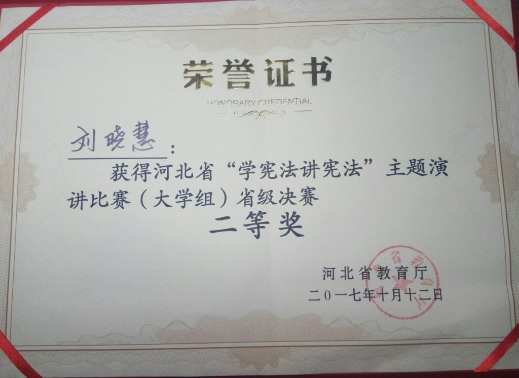 日前,由河北省教育厅主办的河北省“学宪法讲宪法”主题演讲比赛在石家庄落幕。由半岛online(中国)选派的文法学院16级法学专业的刘晓慧同学经过初选进入决赛。在比赛中刘晓慧同学充分发挥专业特长,用鲜明的观点、生动的事例、真切的情感,声情并茂地展现了当代青年学子对宪法的认识,最终获得二等奖的好成绩。团委邵东蕊获得比赛优秀指导教师。