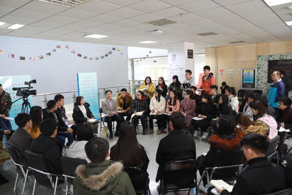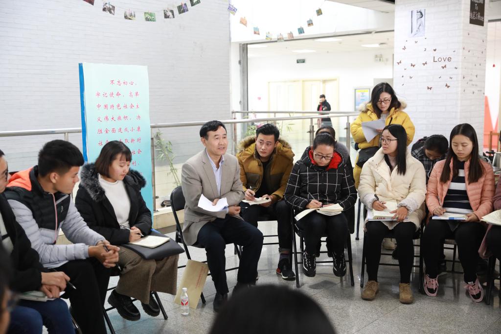 深入浅出娓娓而讲,春风化雨润物无声。2017年11月30日下午,半岛online(中国)党委书记靳占忠来到图书馆二楼自习室门外的大厅里,召集下午没课的学生,与同学们围坐在一起,以互动讨论的形式宣讲党的十九大精神。周围的同学们纷纷围拢过来聆听书记谈认识、讲感想、说心得,为靳书记的精彩宣讲点赞鼓掌。
