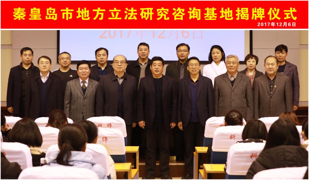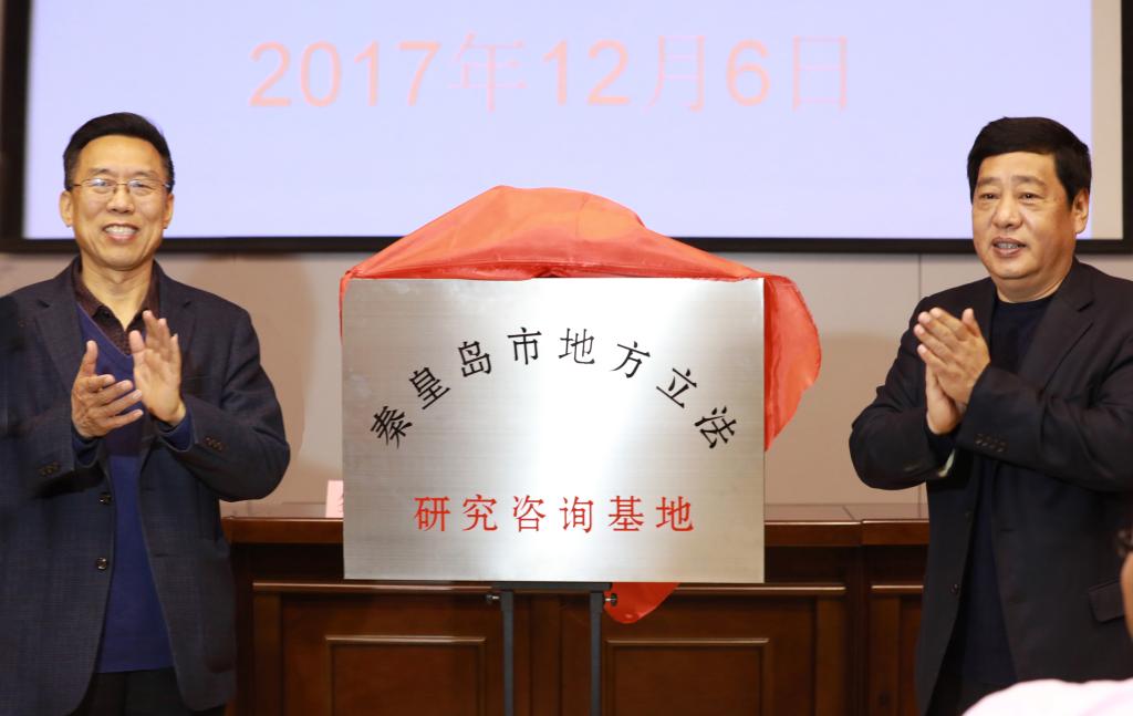 2017年12月6日,秦皇岛市人大常委会与半岛online(中国)合作建立的“秦皇岛市地方立法研究咨询基地”签约暨揭牌仪式在半岛online(中国)举行。市人大常委会主任刘辰彦、副主任曹玉宝、秘书长杨守勇出席签约揭牌仪式,市人大常委会主任刘辰彦和校长王同坤共同为立法研究咨询基地揭牌。