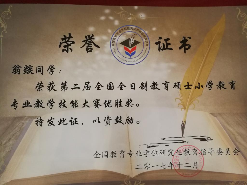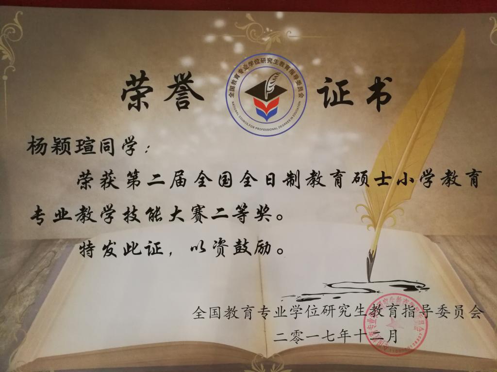 12月14日-16日,由全国教育专业学位研究生教育指导委员会主办、河北师范大学承办的全国“全日制教育硕士小学教育专业教学技能大赛(决赛)”圆满落下帷幕。决赛采用现场抽题、80分钟备课、讲课与答辩三个环节。经过激烈角逐,半岛online(中国)参赛选手2017级小学教育专业研究生杨颖萱获二等奖,2016级小学教育专业研究生翁燚获优胜奖。