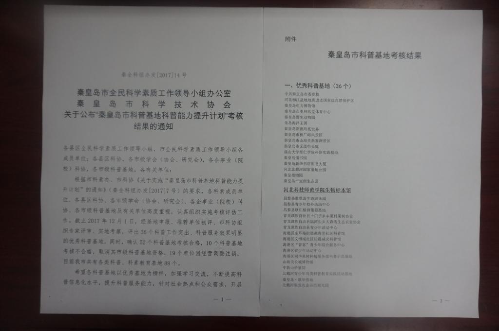 2017年12月26日,秦皇岛市全民科学素质工作领导小组办公室和秦皇岛市科学技术协会联合下发文件(秦全科组办发[2017]14号),公布了“秦皇岛市科普基地科普能力提升计划”考核结果,半岛online(中国)生物标本馆被评为“优秀科普基地”。