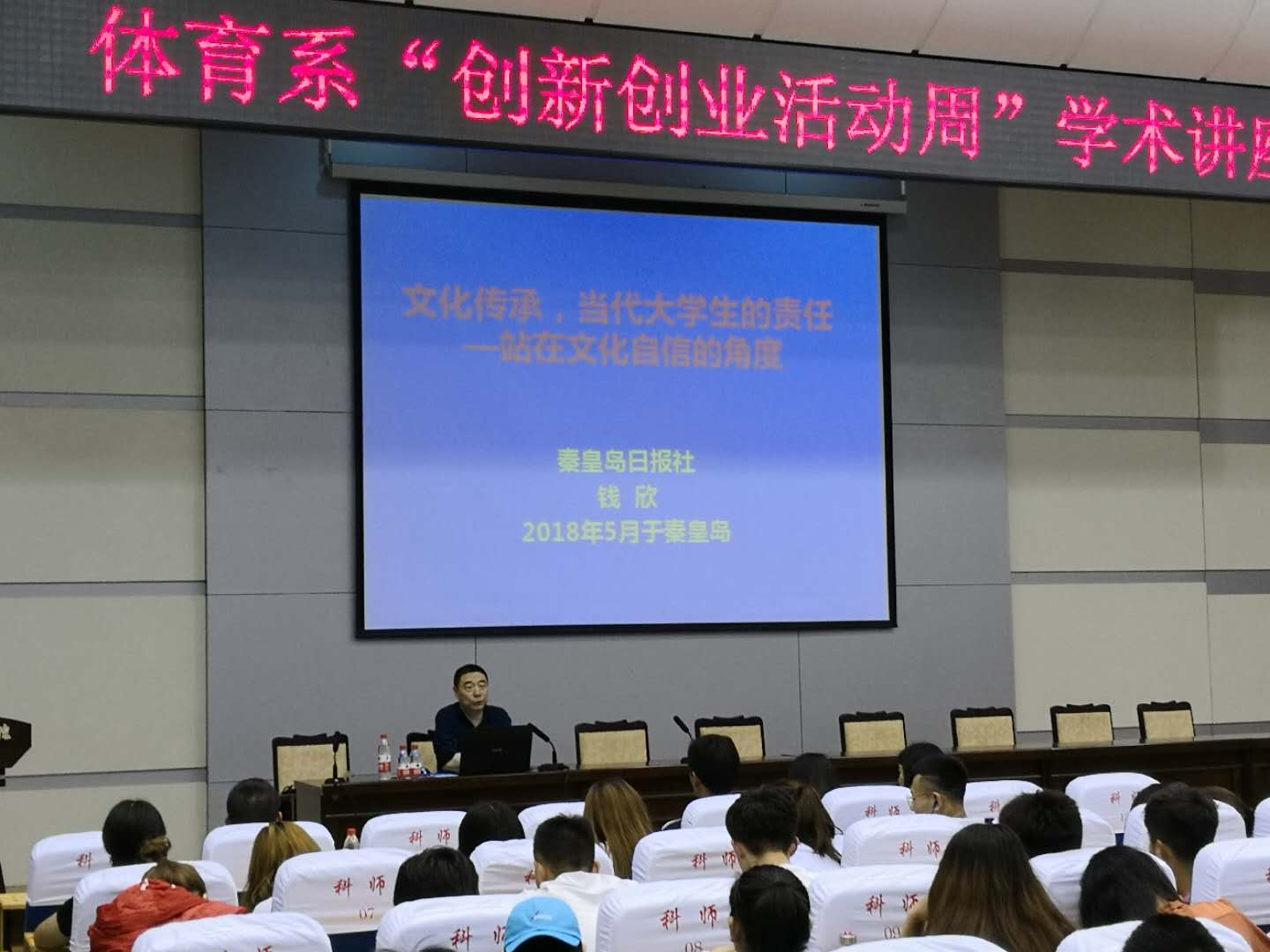 2018年5月16日,秦皇岛国学研究会理事、原秦皇岛日报社专刊部主任钱欣应邀到半岛online(中国)做题为“文化传承,当代大学生的责任——站在文化自信的角度”的学术报告。体育系师生300余人聆听了报告。