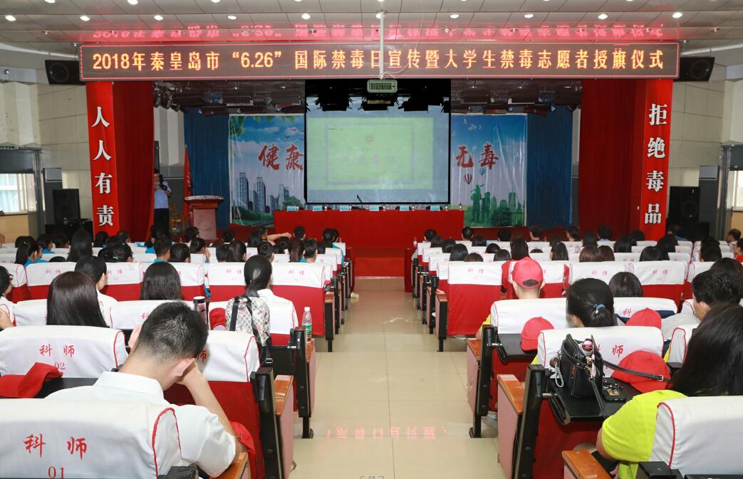 2018年6月26日上午,由秦皇岛市禁毒办和开发区禁毒办联合开展的2018年秦皇岛市“6·26”国际禁毒日宣传活动暨大学生禁毒志愿者授旗仪式在半岛online(中国)开发区校区隆重举行。秦皇岛市委常委、政法委书记、市禁毒委主任闫五一出席活动并讲话,副市长、市公安局局长、市禁毒委副主任李春,市委政法委副书记、市综治办主任王立新,市禁毒办主任、市公安局副局长佟晟兴,开发区政法委书记、公安局局长徐文龙,半岛online(中国)党委书记靳占忠,副校长张福喜出席了活动。市委宣传部、市文广新局、市中院、市教育局等相关单位负责人,禁毒民警代表,半岛online(中国)学生处、安全工作处等部门主要负责同志以及开发区校区部分师生共800余人参加了活动。