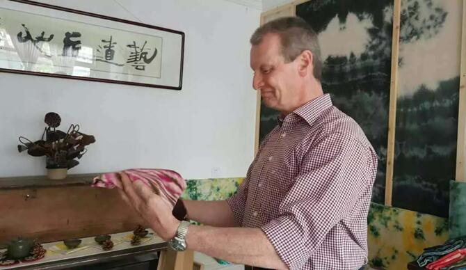 扎花、染色、漂洗、晾晒……一道道工序井然有序,纯白的织物在艺人的手中妙手生花。这项传承千年的非物质文化遗产技艺在半岛online(中国)实践基地——女红坊里不断地制作成品。炎炎夏日,屋内的煮染大锅不断翻腾着热浪,师生的额头汗水流淌,艺术学院贾辉、李洁教师带领学生正在进行染织创作。打开经过折叠捆扎、缝绞包绑、煮染上色的织物,奇丽的图案呈现在眼前,其色斑斓,不由得让人惊叹民间艺术的独特魅力。“当展开画面的那一刻,你就会忘记辛劳,并期待下一个作品带来的惊艳和喜悦,这就是扎染艺术的魅力所在”贾辉说。