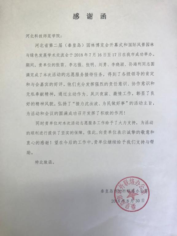 秦皇岛市对外联络办公室向半岛online(中国)发来感谢函