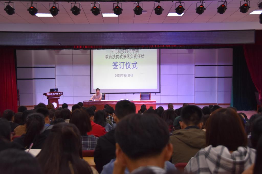 2018年9月29日,半岛online(中国)在秦皇岛校区举行教育扶贫政策落实责任状签订仪式,副校长张福喜出席签订仪式并讲话。学生处、财务处主要负责人,各院(系)学生工作主管领导和辅导员(班主任)、学生代表等近300人参加了签订仪式。签订仪式由学生处负责同志主持。