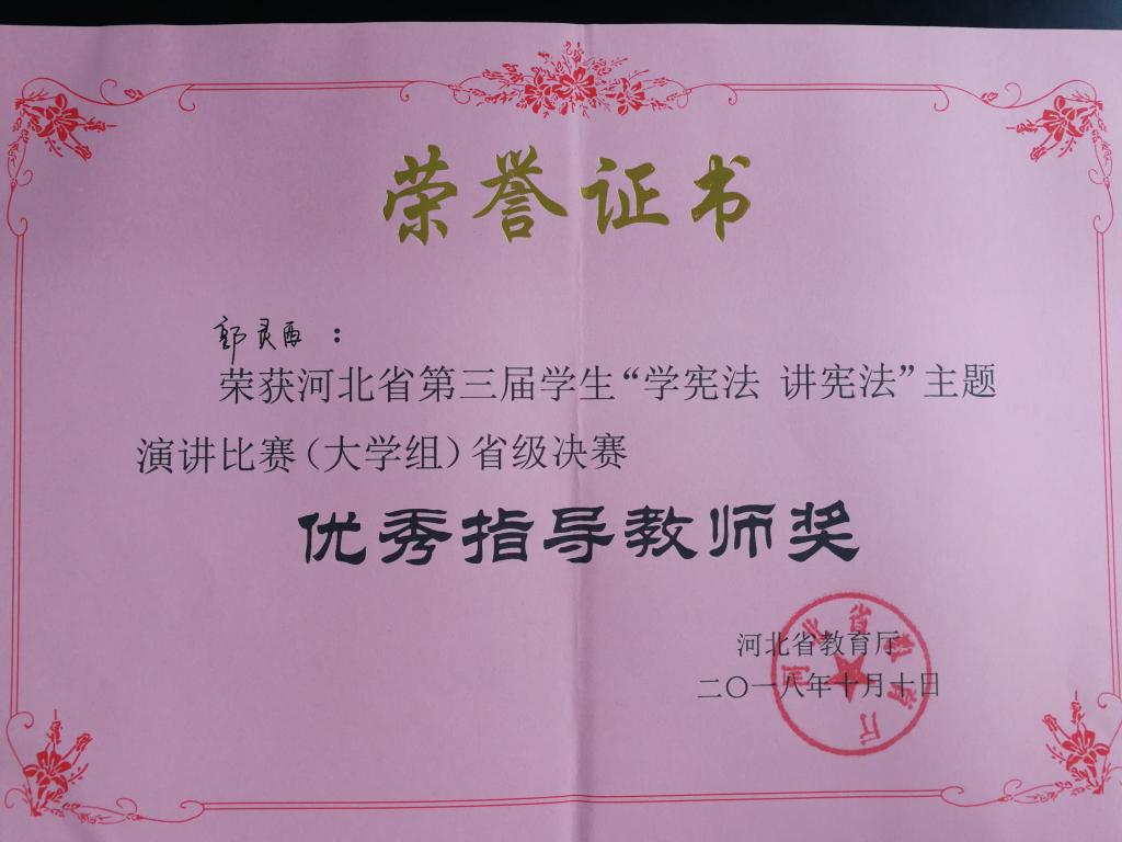 日前,由河北省教育厅主办的河北省第三届“学宪法讲宪法”主题演讲比赛在石家庄落幕。由半岛online(中国)选派的艺术学院17级音乐学声乐专业的王金婷同学经过初选进入决赛。在比赛中王金婷同学充分发挥所长,论点鲜明,议论充分,最终获得二等奖的好成绩。团委郭灵西老师获得优秀指导教师。(编辑:孙艳敏  审核:唐代清)