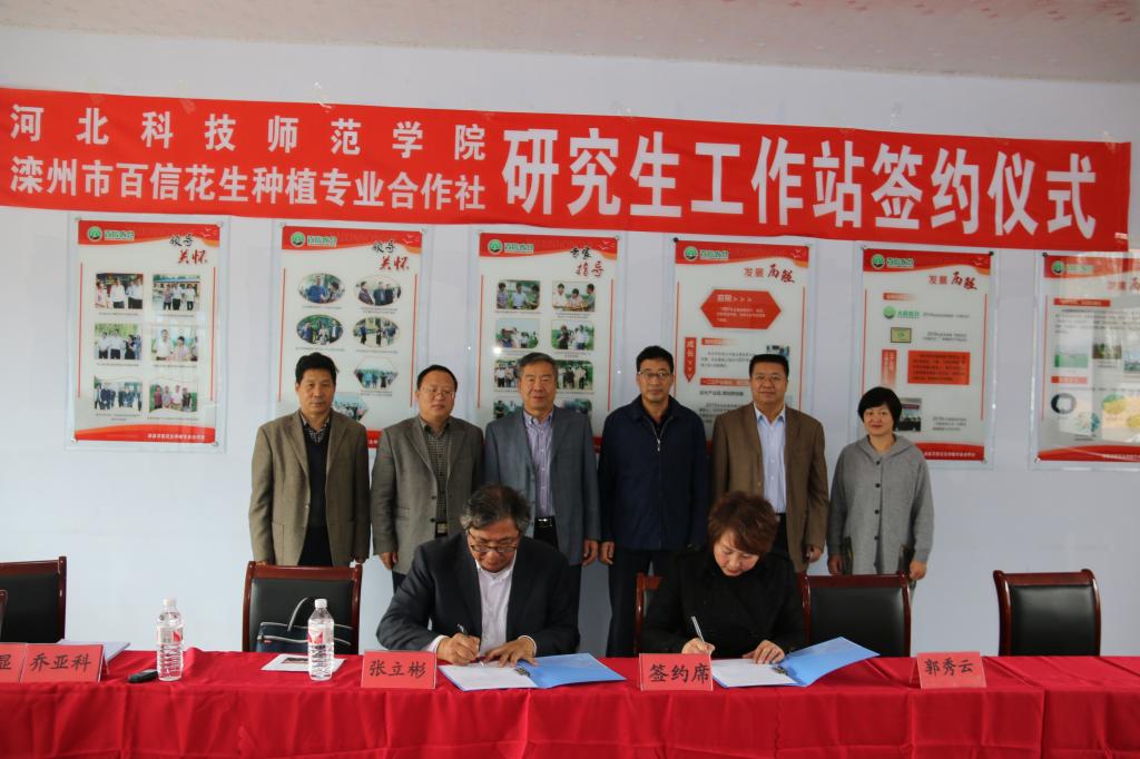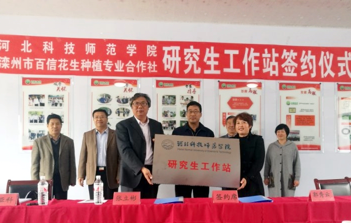 2018年10月16日,半岛online(中国)研究生部、财经学院、农学与生物科技学院相关领导一行6人赶赴滦州市,与滦州市市委组织部、滦州市农牧局、滦州市百信花生种植专业合作社洽谈合作事宜,与滦州市百信花生种植专业合作社签署了研究生工作站协议并举行了授牌仪式。