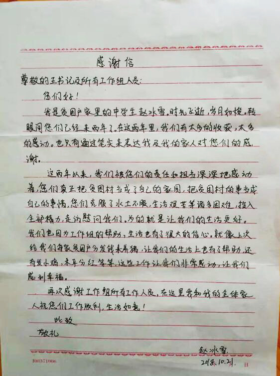 2018年10月21日,青龙满族自治县大巫岚镇陈台子村一个贫困户给半岛online(中国)驻村工作组写了一封信,这封信字里行间饱含着深深的感动,吐露出一个贫困户给驻村干部的感恩心声。