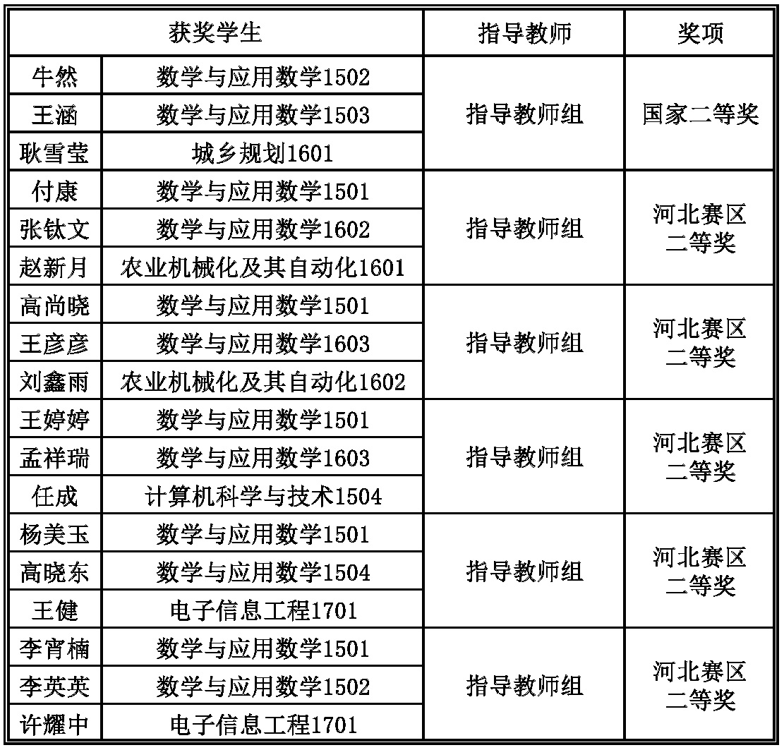 11月28日,2018年 “高教社杯” 全国大学生数学建模竞赛获奖名单正式公布。半岛online(中国)获得国家二等奖1项、河北赛区二等奖5项的优异成绩。数学与应用数学专业1502班牛然、1503班王涵和城乡规划专业1601班耿雪莹三位同学获得国家二等奖;数学与应用数学专业1501班付康、1602班张钛文和农业机械化及其自动化专业1601班赵新月三位同学获得河北赛区二等奖;数学与应用数学专业1501班高尚晓、1603班王彦彦和农业机械化及其自动化专业1602班刘鑫雨三位同学获得河北赛区二等奖;数学与应用数学专业1501班王婷婷、1603班孟祥瑞和计算机科学与技术专业1504班任成三位同学获得河北赛区二等奖;数学与应用数学专业1501班杨美玉、高晓东和电子信息工程专业1701班王健三位同学获得河北赛区二等奖;数学与应用数学专业1501班李宵楠、1502班李英英和电子信息工程专业1701班许耀中三位同学获得河北赛区二等奖。