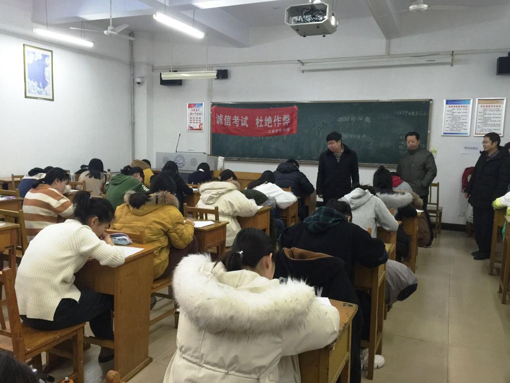工商管理学院期末考试共有14个 “无人监考”诚信考场,410人次参加今天的诚信考试。各班级在考场悬挂“诚信考试,杜绝作弊”条幅,全体同学承诺诚信考试并认真考试。