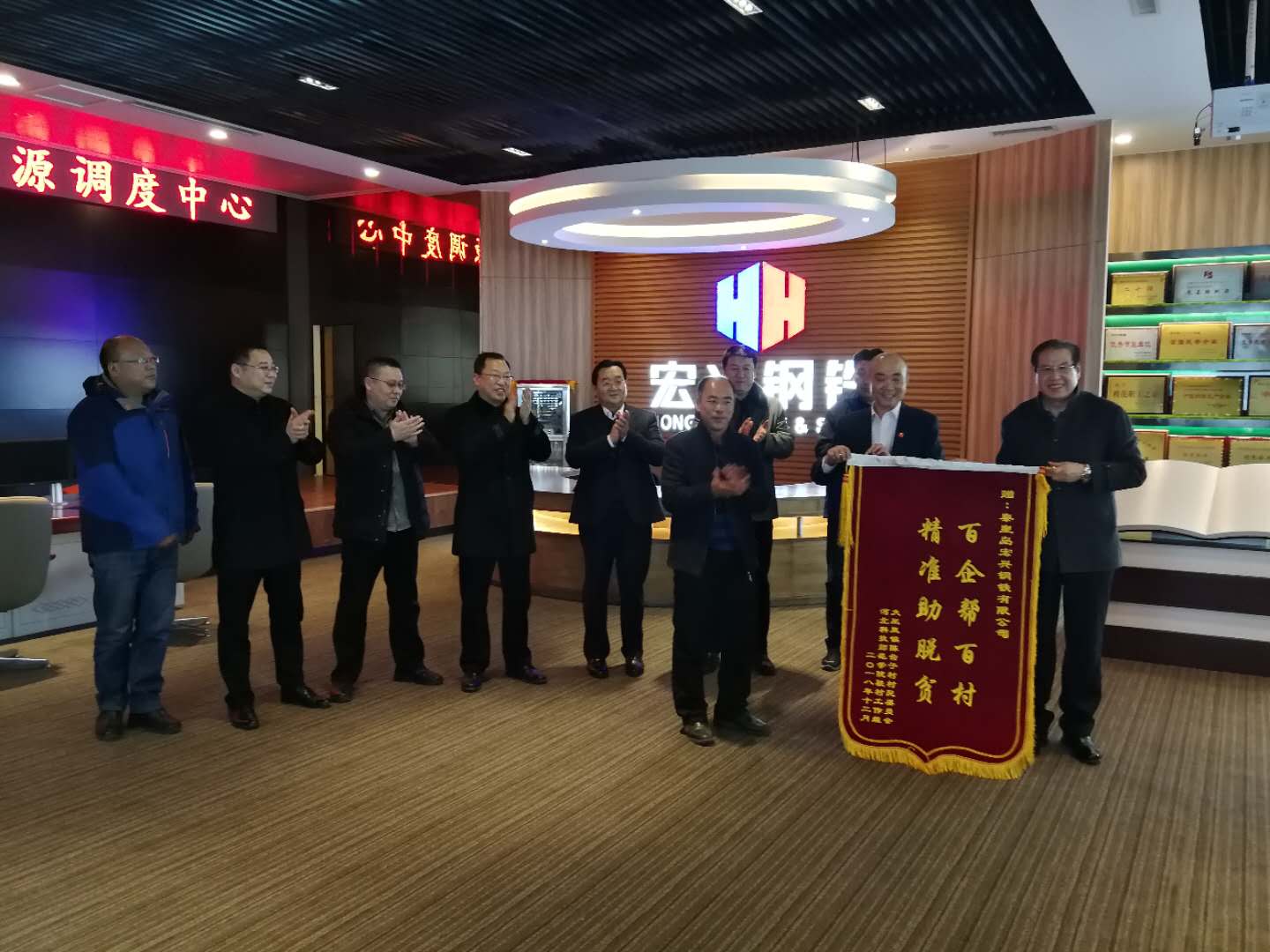 座谈会后,陈台子村书记王建华代表全体村民为宏兴钢铁送上“百企帮百村精准助脱贫”锦旗。(编辑:孙艳敏  审核:唐代清)
