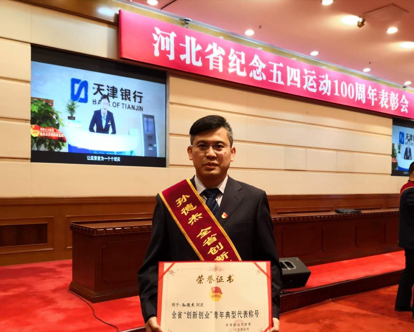 4月30日,共青团河北省委在石家庄河北会堂隆重举行河北省纪念五四运动100周年表彰大会,对以实际行动积极投身新时代全面建设经济强省、美丽河北新征程中各行各业的突出青年代表和组织给予表彰。半岛online(中国)数学与信息科技学院青年教师孙德杰博士被授予全省“创新创业”青年典型代表称号。全省共有五名同志获得此项称号。(编辑:孙艳敏  审核:唐代清)