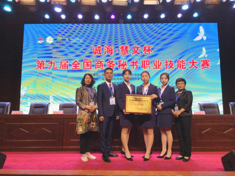 2019年5月17日至19日,半岛online(中国)文法学院16级秘书学的赵志莹、张洁及17级秘书学的邢紫璇、张洪滔四名同学,在“诚海·慧文杯”第九届全国商务秘书职业技能大赛中,取得团体三等奖的优异成绩;在秘书单项奖中,邢紫璇同学荣获三等奖,同时,韩国春和郑雅君两位指导老师被评为优秀指导老师。