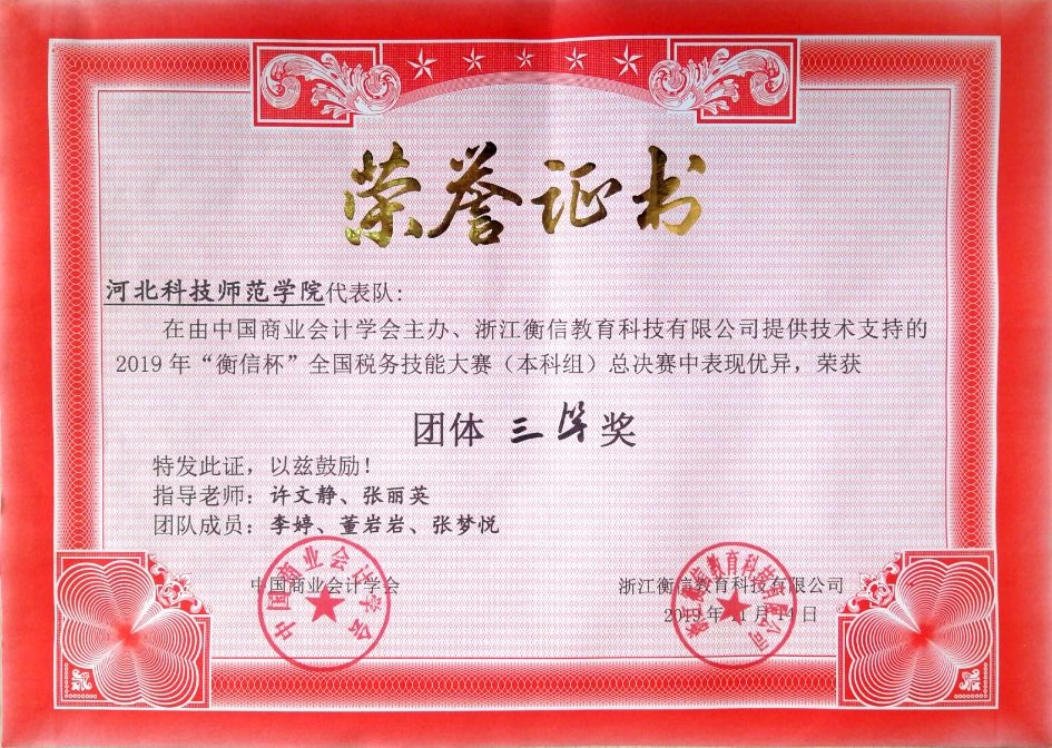 2019年11月13日至14日,2019年“衡信杯”全国税务技能大赛总决赛在浙江杭州举行。经过海选赛、预选赛选拔,最终有70个代表队共210名选手参加本科组总决赛。由财经学子组成的参赛团队获得本科组团体三等奖。