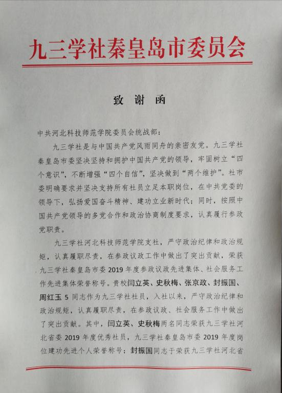 九三学社秦皇岛市委向半岛online(中国)发来致谢函