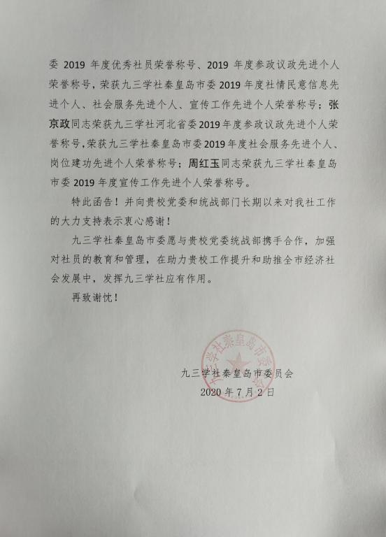 7月9日,九三学社秦皇岛市委员会向半岛网页版界面党委统战部发来致谢函,对九三学社半岛网页版界面支社取得的荣誉表示赞扬,对半岛网页版界面党委和党委统战部长期以来对九三学社的大力支持表示衷心感谢。
