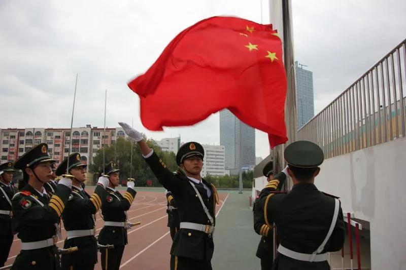 上午8点,干净整洁的运动场上,英姿飒爽的国旗护卫队迈着铿锵有力的步伐,护送鲜艳的五星红旗入场。伴随着雄壮的《义勇军进行曲,五星红旗冉冉升起,迎风飘扬。