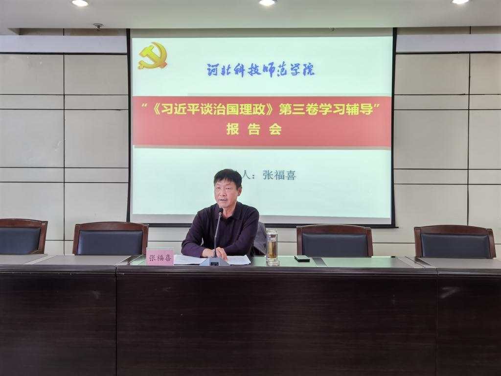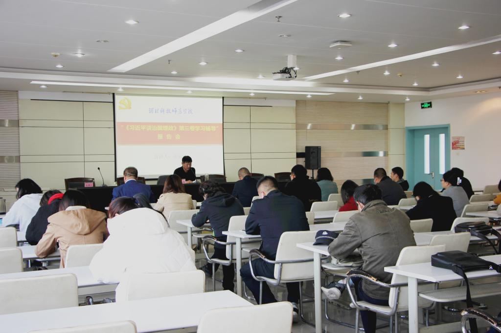 2020年10月28日下午,校党委常委、副校长张福喜党委学工部、学生处、团委、安全工作部(处)、武装部工作人员作《习近平谈治国理政》第三卷辅导报告。