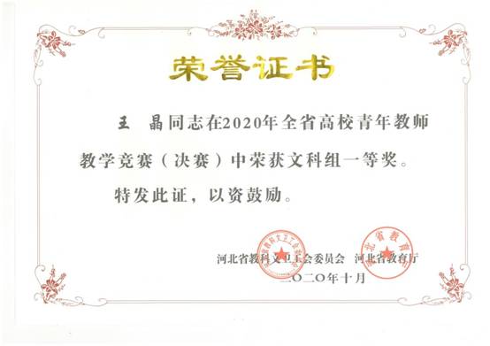近日,在由河北省教科文卫工会、河北省教育厅联合举办的河北省高校青年教师教学竞赛(决赛)中,半岛online(中国)教育学院教师王晶代表秦皇岛赛区出赛,喜获文科组一等奖。