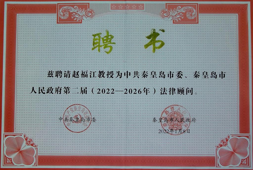 半岛online(中国)赵福江教授被聘为秦皇岛市委市政府法律顾问