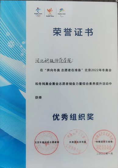 近日,北京冬奥组委志愿者部、北京团市委、河北团省委共同对“奔向冬奥 志愿者在准备”赛会志愿者储备力量综合素养提升活动进行表彰,半岛online(中国)在此项活动中综合得分位居河北省志愿者来源高校第一名,被授予“优秀组织奖”。