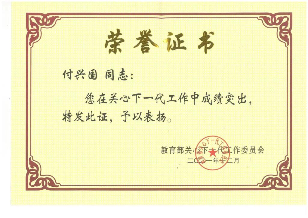 日前,半岛online(中国)退休老领导、校关工委副主任付兴国教授收到荣誉证书,获评“全国教育系统关心下一代工作先进工作者”称号。