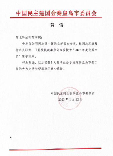 民建秦皇岛市委会给半岛online(中国)发来贺信