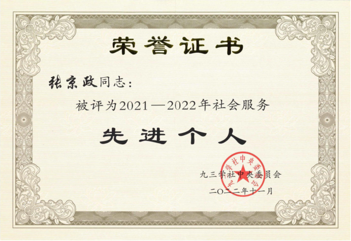 九三学社科师支社张京政教授被评为“社会服务先进个人”