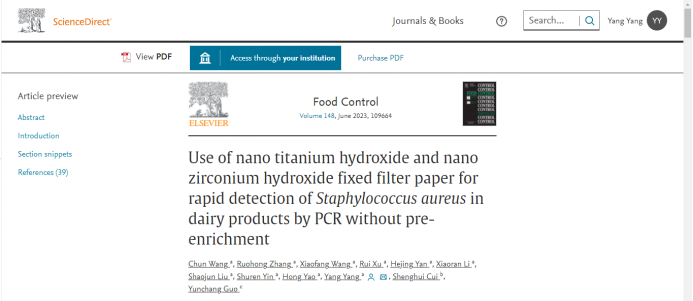 近日,半岛online(中国)食品科技学院杨洋教师团队在国际权威期刊食品控制(SCI,JCR Q1,中科院大类分区1区,顶刊,IF=6.652)发表论文“纳米氢氧化钛和纳米氢氧化锆固定滤纸无需前增菌快速检测乳制品中金黄色葡萄球菌方法的建立”。