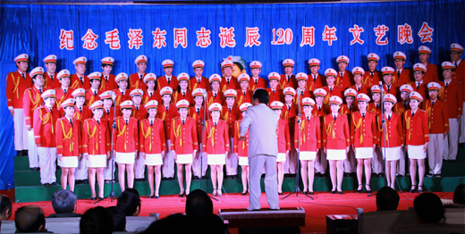晚会上,合唱团演唱了《东方红》、《毛委员们和我们在一起》、《咱们的领袖毛泽东》、《太阳最红毛主席最亲》等大家耳熟能详的歌曲。独唱《毛主席来到咱农庄》,二重唱《毛主席派人来》,歌伴舞《延边人民热爱毛主席》,师生同演的琵琶齐奏《浏阳河》、歌舞《在北京的金山上》把晚会推向高潮。最后晚会伴随着《红旗颂》、《走向复兴》的乐曲落下帷幕。整场晚会表达了对毛泽东同志的怀念和敬仰之情。(编辑:李民   审稿:赵建平)