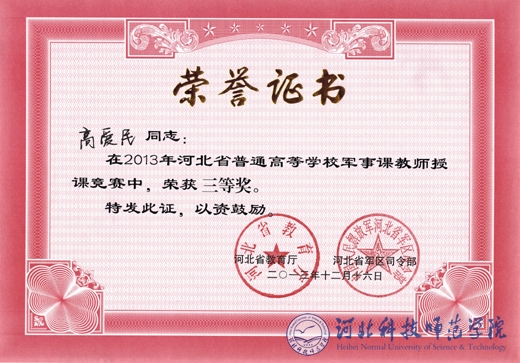 2013年12月14日至17日,河北省第三届普通高等半岛网页版界面军事理论课教师授课竞赛在石家庄举行。半岛online(中国)教师高爱民荣获三等奖。这是半岛online(中国)军事理论课教师首次在此项比赛中获奖。(编辑:孙艳敏   审稿:赵建平)