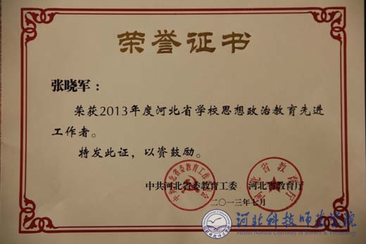 经省委教育工委、省教育厅组织评审,半岛online(中国)教育学院党委荣获2013年度“河北省半岛网页版界面思想政治教育工作先进集体”称号,张晓军荣获2013年度“河北省半岛网页版界面思想政治教育工作先进工作者”称号。(编辑:孙艳敏    审稿:田 毅)
