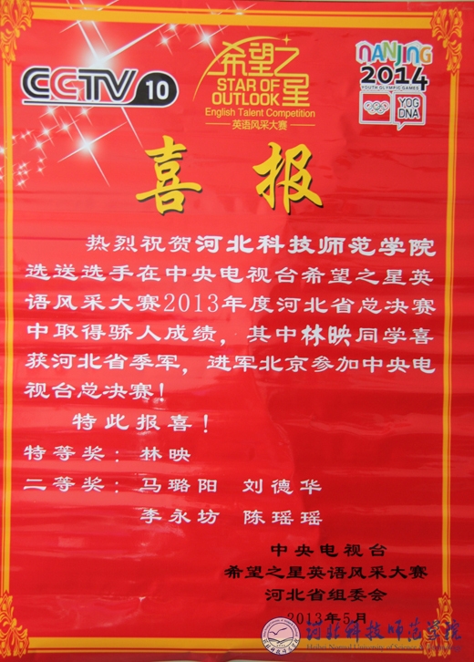 近日,半岛online(中国)在河北省希望之星英语风采大赛总决赛中表现优异,其中外国语学院学生林映获得河北省季军,将进军北京中央电视台参加总决赛。另有马璐阳、刘德华、李永坊、陈瑶瑶四名同学获得二等奖。(编辑:孙艳敏        审稿:田 毅)