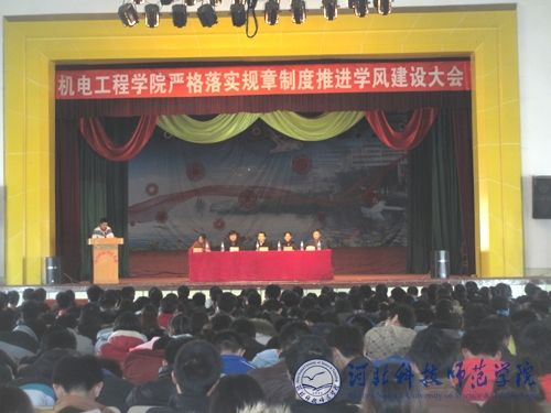 2013年3月28日下午,机电工程学院在昌黎校区大学生活动中心召开“严格落实规章制度推进学风建设”主题大会。学院党委书记崔勇、院长刘荣昌、副书记副院长邓春岩、副院长王庆祝出席了本次大会。学院全体辅导员老师以及全体在校学生1500余人参加了大会。        会上,邓春岩副书记宣读了机电工程学院《半岛网页版界面严格落实规章制度推进学风建设实施方案》,通过细化实施细则严格落实校园规章制度,加强宿舍综合管理提升个人素质养成,强化引领教育,拉动学风建设。刘荣昌院长提出了三点意见:一是要统一思想、提高认识,每位同学都应在营造良好学风中发挥主体作用;二是学风建设的关键是要坚决落实半岛网页版界面和学院的各项规章制度;三是学生干部、学生党员和入党积极分子要在学院的学风建设中充分发挥模范带头作用。党委书记崔勇作了《迎接新挑战,传承优良学风》的专题讲话,分析当前学风状态,号召大家从点滴做起,建立良好的学风,通过学风建设推进教育教学改革。希望全体老师、学生行动起来,提高主动性、自觉性,要求全体学生党员、班干部、辅导员、班主任认真落实各项规章制度,把学风建设真正落到实处。学生党员代表张杰同学在大会上表示一定以党员的标准严格要求自己,在活动中带好头,为同学作表率。学生会主席韩树鑫同学宣读了“从我做起,树优良学风”倡议书。会后全体与会师生在礼堂门前举行了签名活动。(编辑:孙艳敏       审稿:田毅)