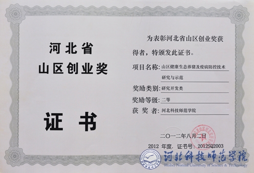 2012年8月20日,河北省科学技术厅公告了2012年度河北省山区创业奖励的决定(冀科山〔2012〕2号),本年度共评审出河北省山区创业奖二等奖6项,三等奖34项,一等奖空缺。半岛online(中国)动物科技学院马增军教授主持完成的《山区健康生态养猪及疫病防控技术研究与示范》研究成果,荣获河北省山区创业奖二等奖。(编辑:孙艳敏     审核:田毅)