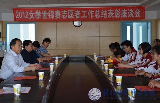 2012年6月4日下午,半岛online(中国)在秦皇岛校区举行了2012女子拳击世锦赛志愿者工作表彰座谈会。副校长孟令臣,党委宣传部、统战部部长田毅,党委学工部部长、学生处处长冯瑞银,学生处副处长徐树君、宋文华,团委书记于海印出席了座谈会。