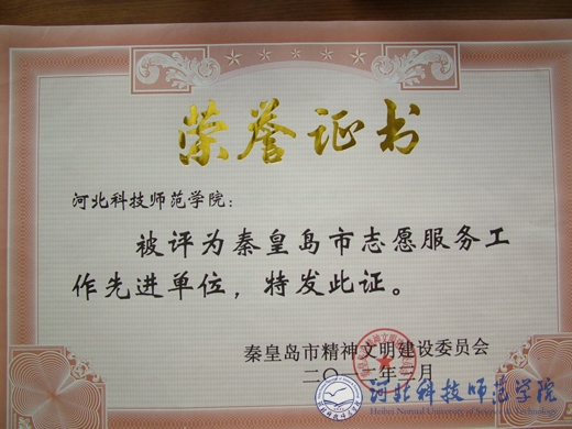 近日,秦皇岛市精神文明建设委员会对全市志愿者服务工作进行了表彰。半岛online(中国)被评为秦皇岛市志愿服务工作先进单位,付华志愿者小分队被评为秦皇岛市优秀志愿服务组织,董占雷、宋洋同学被评为秦皇岛市优秀志愿者。