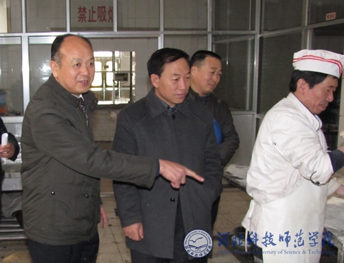 图为副校长郭国维(左一)、党委常委杨洪青(左二)在学生食堂检查指导工作