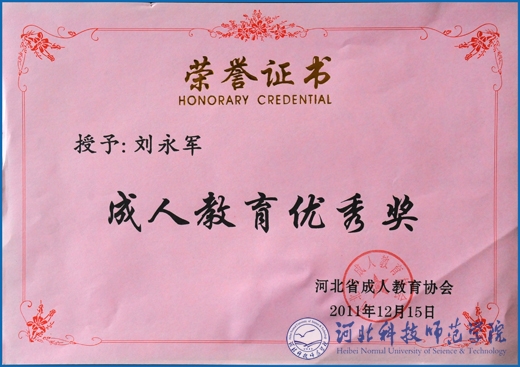 图为刘永军老师获得的荣誉证书