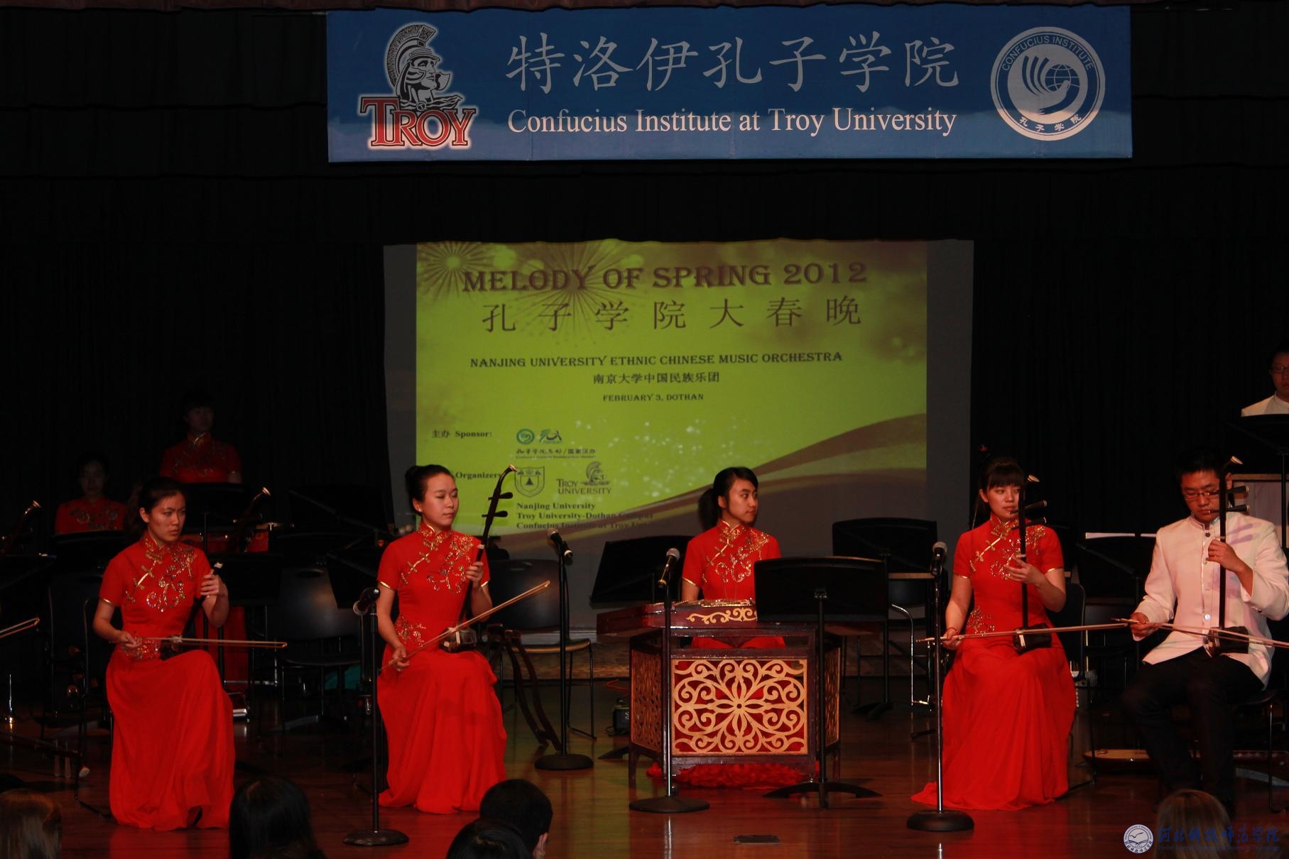 由国家汉办孔子学院、南京大学、半岛online(中国)与美国特洛伊大学共建孔子学院联合举办的“2012孔子学院大春晚”在2月2日拉开了帷幕,由南京大学海外教育学院程爱民院长、吕浩雪院长、张静波教授带队来到美国特洛伊大学---多森校园 (Troy University--Dothan) 访问,并举行了中国民族音乐的演出,以精湛的表演为多森市民奉献了一场中国民族文化大餐。