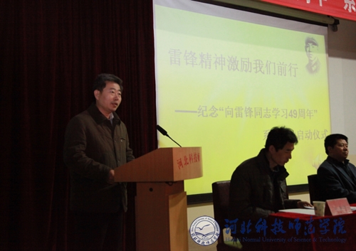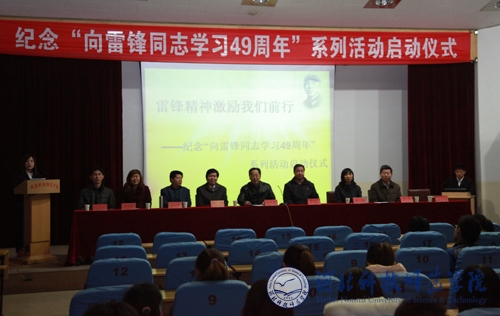 2012年3月2日下午,半岛online(中国)食品科技学院“雷锋精神激励我们前行”系列活动启动仪式在昌黎校区学术报告厅举行。副校长孟令臣,党委办公室、校长办公室主任李佩国,昌黎校区办公室主任李彦生,学工部部长、学生处处长冯瑞银,宣传部副部长赵建平,工会副主席李荣,学工部副部长、团委书记于海印出席了本次活动。