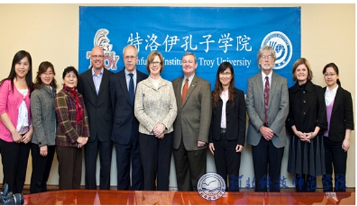 2011年10月6日,美国特洛伊大学专门为半岛online(中国)赴美任教的周红玉、邢杰、裴艳丽、孙国欣四位老师举行了欢迎仪式。特洛伊大学第一副校长英格拉姆博士,助理副校长波特博士、微兹拉克博士以及孔子学院美方院长徐弘博士、中方院长陈晓枫副教授等出席欢迎仪式。