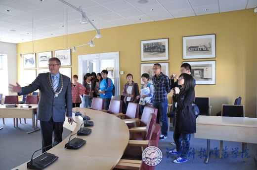 图为约灵市市长引领同学们参观市政厅