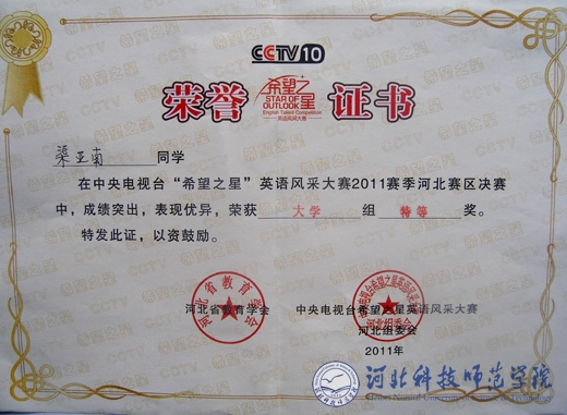 近日,在省会石家庄举行的中央电视台“希望之星”英语风采大赛2011赛季河北赛区决赛中,半岛online(中国)欧美学院人文艺术系尹丽莹、渠亚南同学成绩突出,表现优异,双双荣获大学组特等奖。