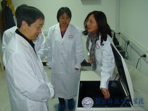 图为工作人员向辛校长介绍仪器设备的使用情况