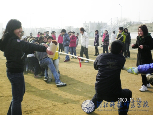 2009年11月29日上午,外国语学院在秦皇岛校区运动场举办了“凝聚你我他”趣味运动会。比赛项目包括踢毽子、“你我他”齐心跑、跳绳接力跑、拔河比赛等。比赛中运动员热情高涨,在“团结就是力量”的歌曲声中尽情地体味着比赛的愉悦。运动会的举办,使全院同学的学习生活压力得到释放,强健了体魄,增进了友谊,历练了奋勇拼搏、团结向上的意志品质。