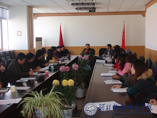 会上,招生就业处张福喜处长首先传达了2009年河北省高校学生工作会议暨河北省高校学生工作研究会第十三届年会上教育部高校学生司张浩明副司长和河北省教育厅闫春来副厅长的讲话精神。招生就业处副处长白雪松对2010届的毕业生就业工作进行了详细部署。招生就业处还对毕业生宣传材料的邮寄、就业协议书的发放填写和新生档案的收缴工作进行了统一布置。